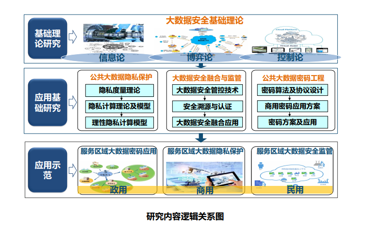 在关键技术研究方面,以网络安全理论与技术为基础,密码学和隐私保护方法为核心,形成大数据全生命周期密文处理技术、隐私保护技术和安全监管技术。